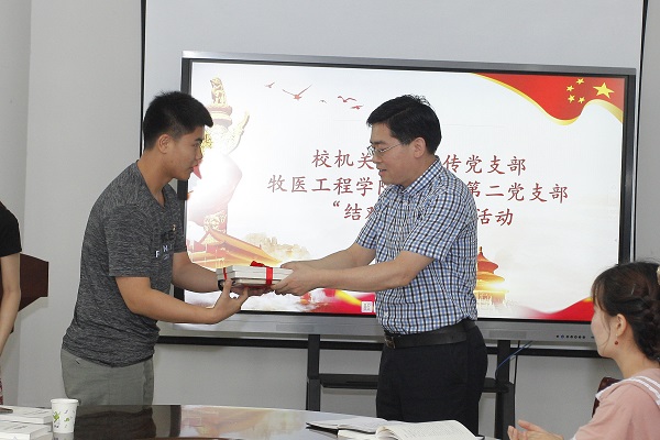 活动中,各支部书记分别介绍了本支部的基本情况,师生党员代表分享了学习《平语近人——习近平总书记用典》的心得体会,双方支部书记签署了支部共建协议,校机关组织宣传党支部向牧医工程学院本科生第二党支部每位党员现场赠送书籍《新时代追梦人》、《习近平讲故事》以及党员学习笔记等学习资料和用具。