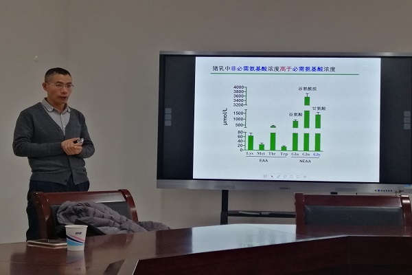 2018年11月29日下午,应我院动物营养与饲料科学系邀请,中国农业大学动物科技学院武振龙教授走入我院教授讲堂,在龙子湖校区第一实验楼北301会议室作了“氨基酸营养研究与仔猪肠道健康”的学术报告。报告由动物营养与饲料科学系教工党支部书记王志祥主持,相关学科的师生参加了报告会。