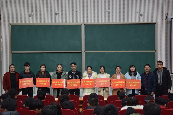 在龙子湖校区繁塔楼大教室七,与会领导首先为我院获得“诸美科研创新奖”的学生颁发奖学金。“诸美科研创意奖”由河南诸美种猪育种集团股份有限公司设立,金额1万元,旨在鼓励大学生在学习理论知识的同时积极参与科研项目,知行合一,学以致用。